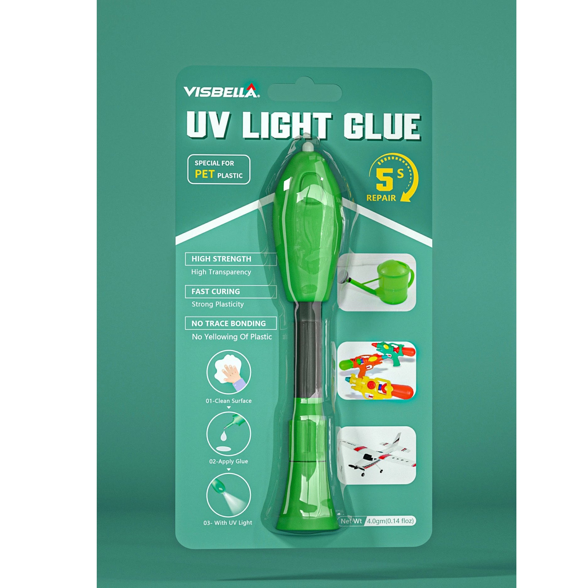 Visbella UV light glue is a fast curing adhesive that can be used in daily repair. It is suitable for bonding metal, glass, ceramics, wood, rubber, PVC, ABS, Acrylic and so on. This product is cured when exposed to UV radiaiton . The speed of cure will depend on the UV intensity as measured at the product surface.The ultraviolet lamp can achieve cure within a short time, safe and convenient operation.