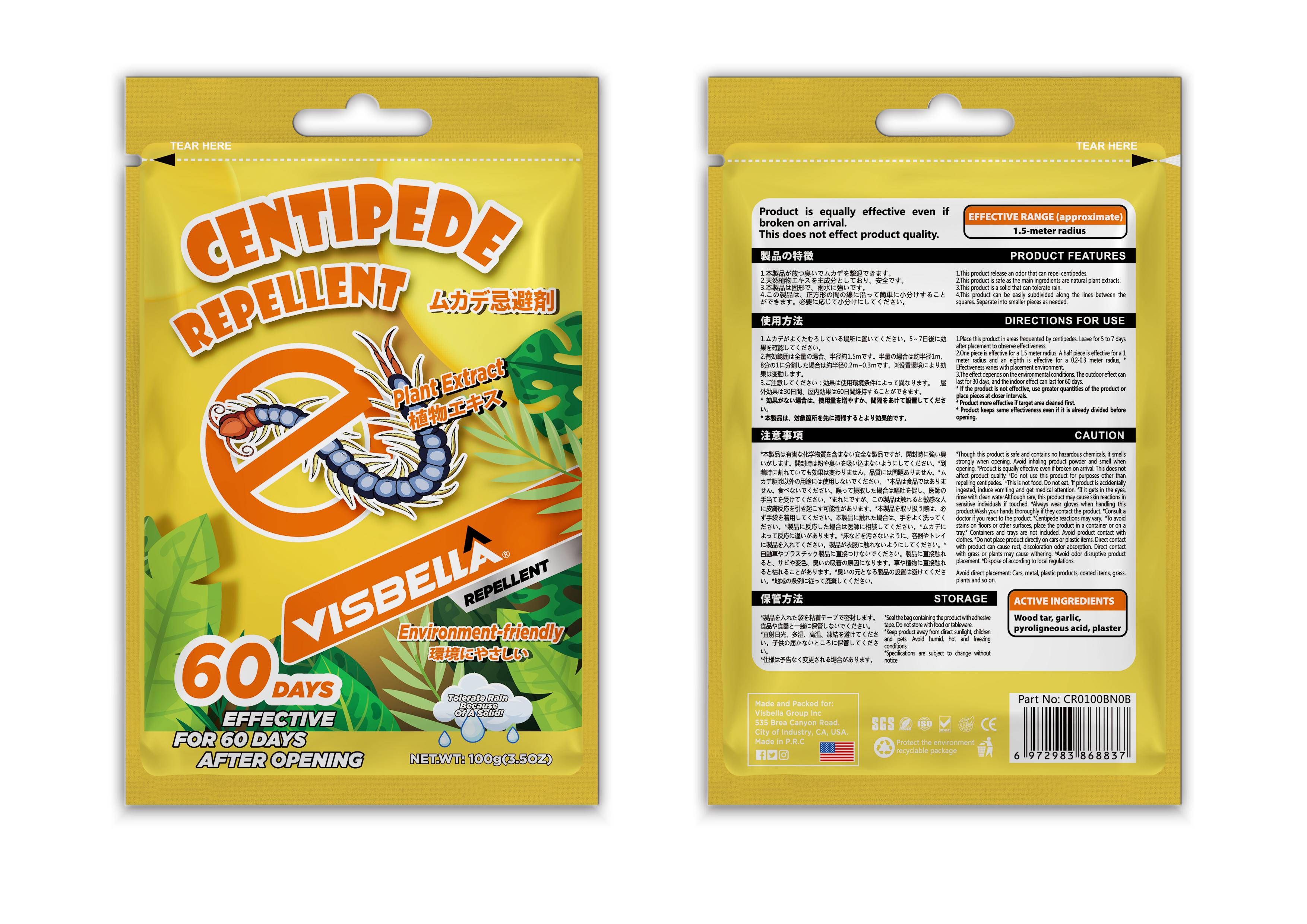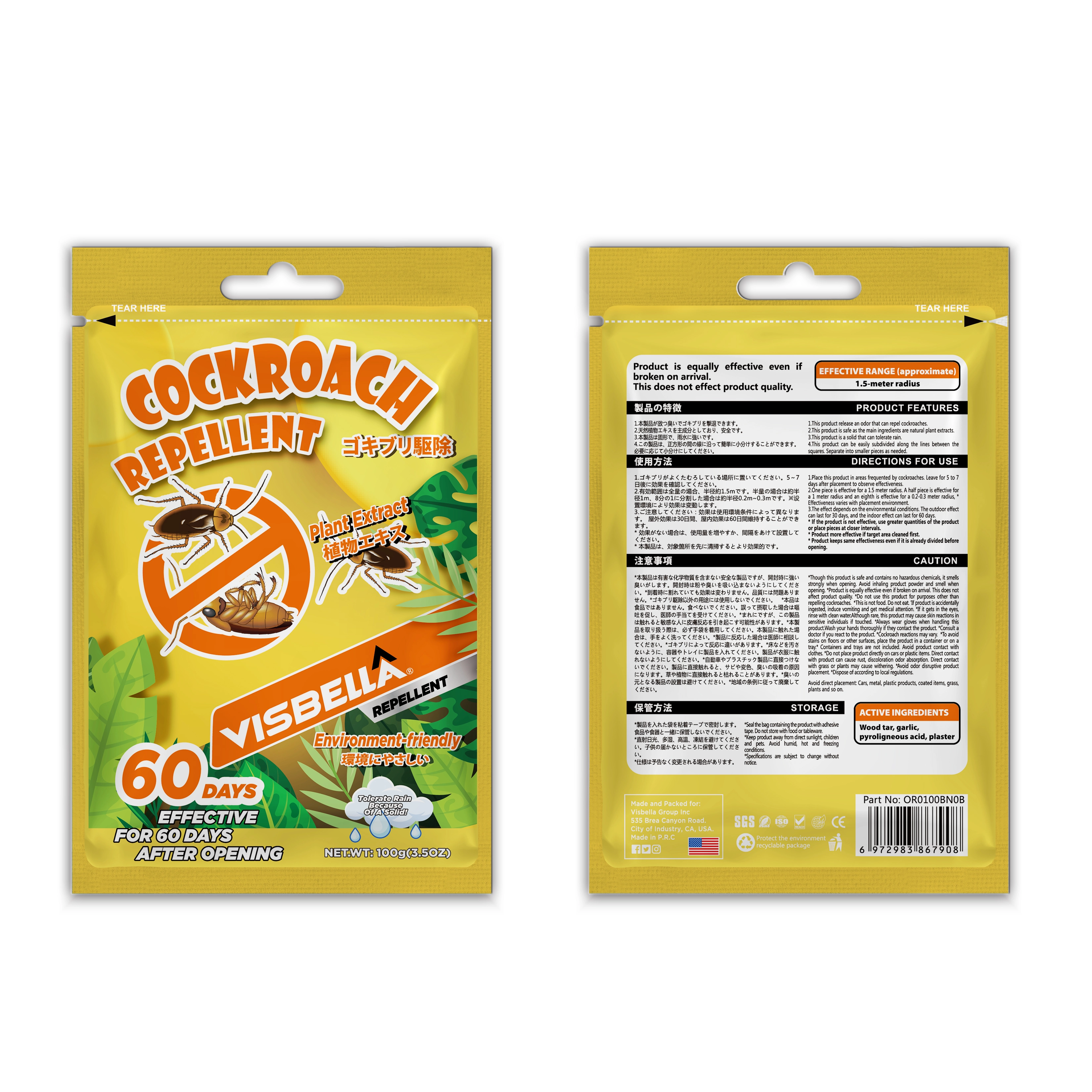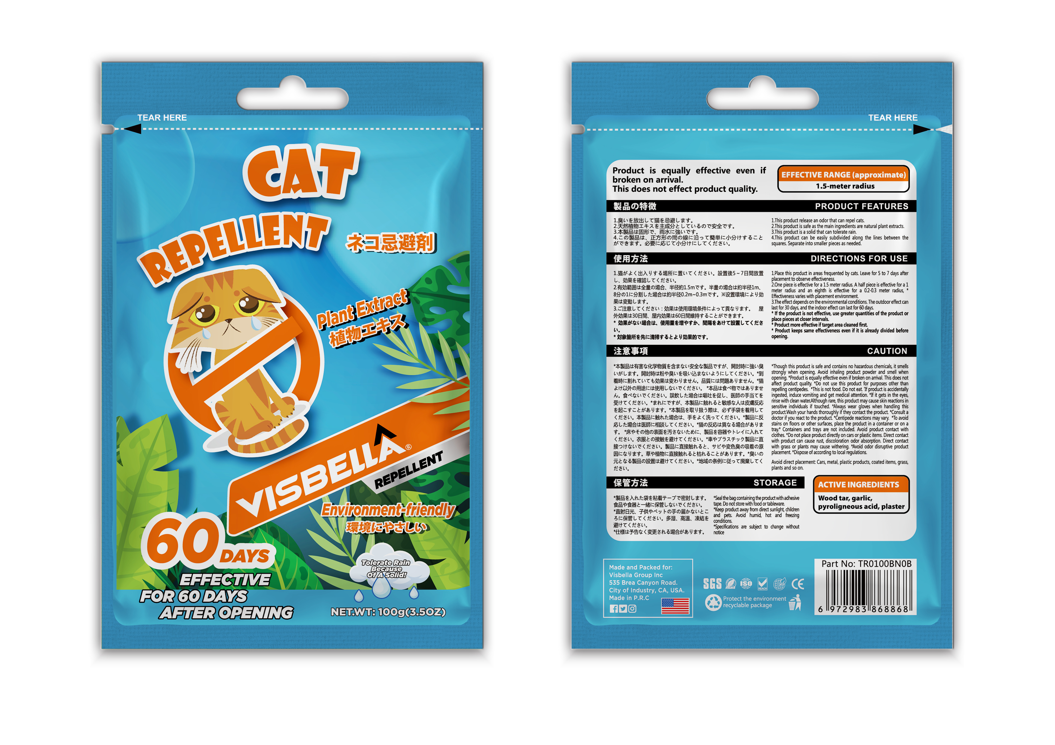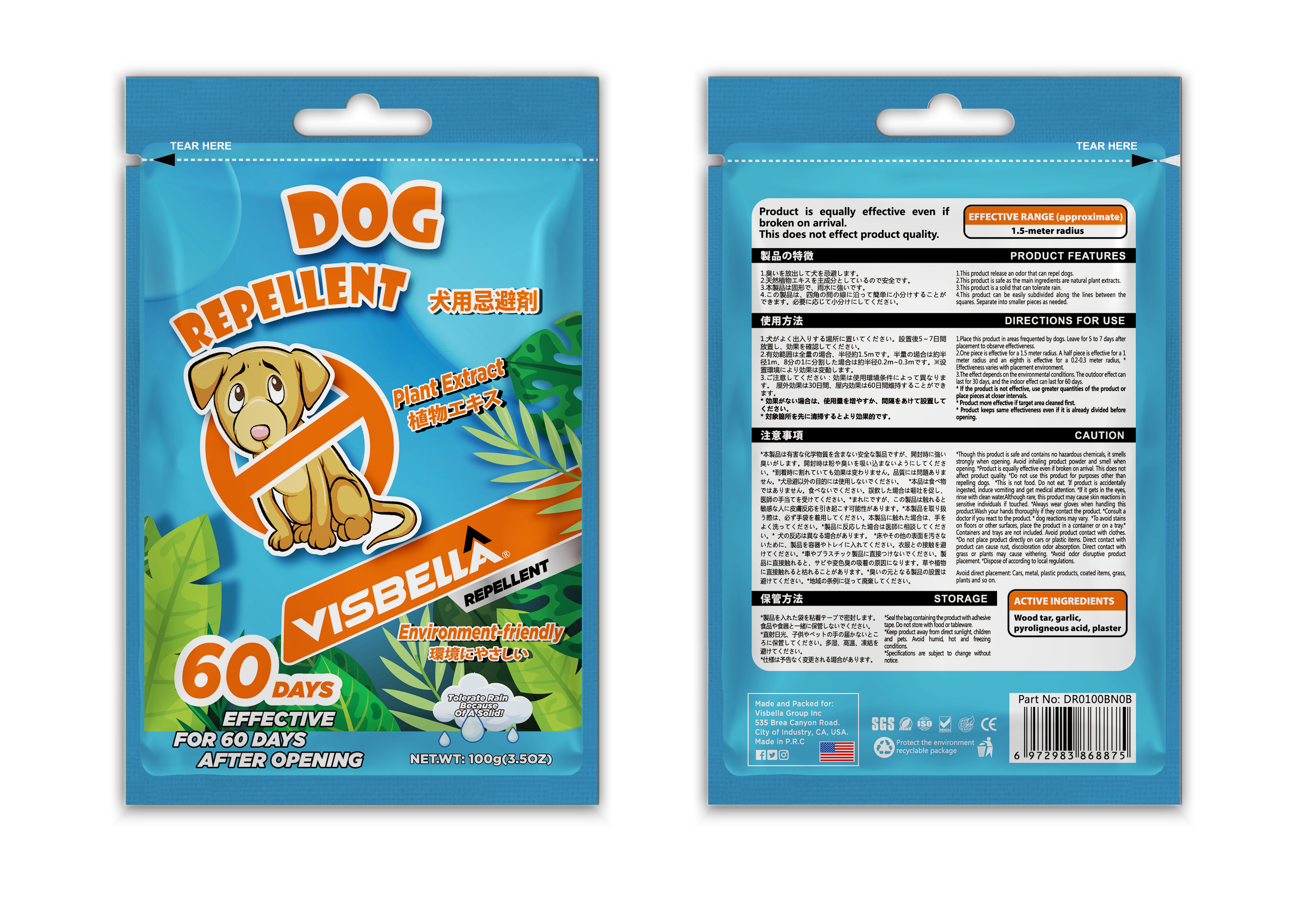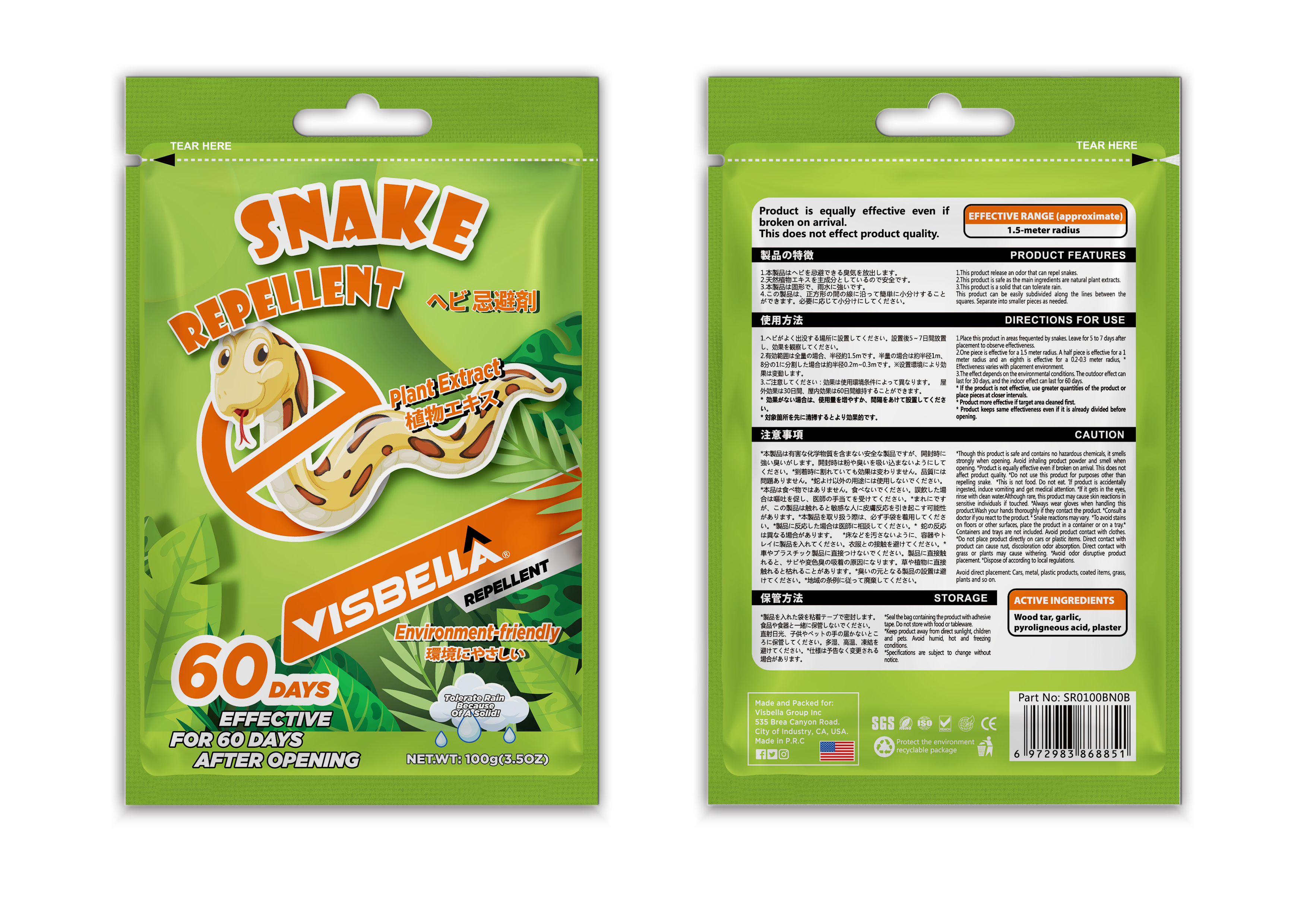 Visbella® This product uses a special smell to repel animals, the raw material uses natural ingredients, the smell spreads quickly, generally lasts 30 days; The product is granular and can be freely dispersed according to the place of use. After the effect of this product disappears, the material can be dissolved in the soil, harmless to the soil, no need to clean and recycle; Do not discharge this product into rivers, ponds, water sources.
