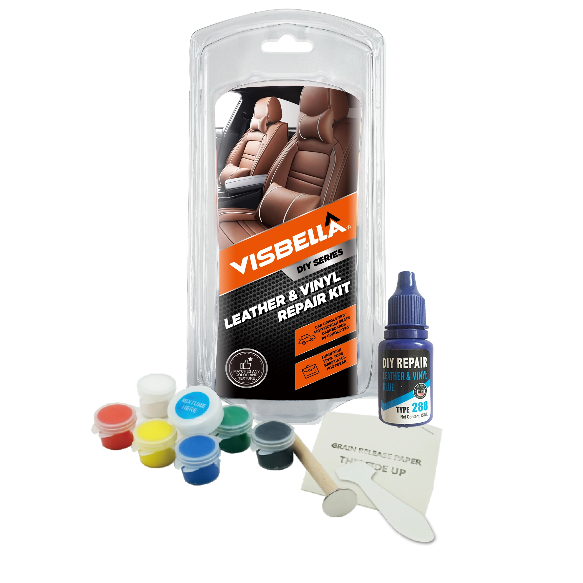 Visbella® DIY Leather and Vinyl Repair Kit is very handy and easy to help you to repair any cracks,cuts,burns and tears on leather and vinyl material surface.A variety of colors and grain papers designed to match surrounding materials makes repairs blend in with existing vinyl or leather. A color matching guide helps determine the correct color to match the damaged surface.With the complete directions included in the kit,you can achieve a quality result without the cost or expertise of a professional.