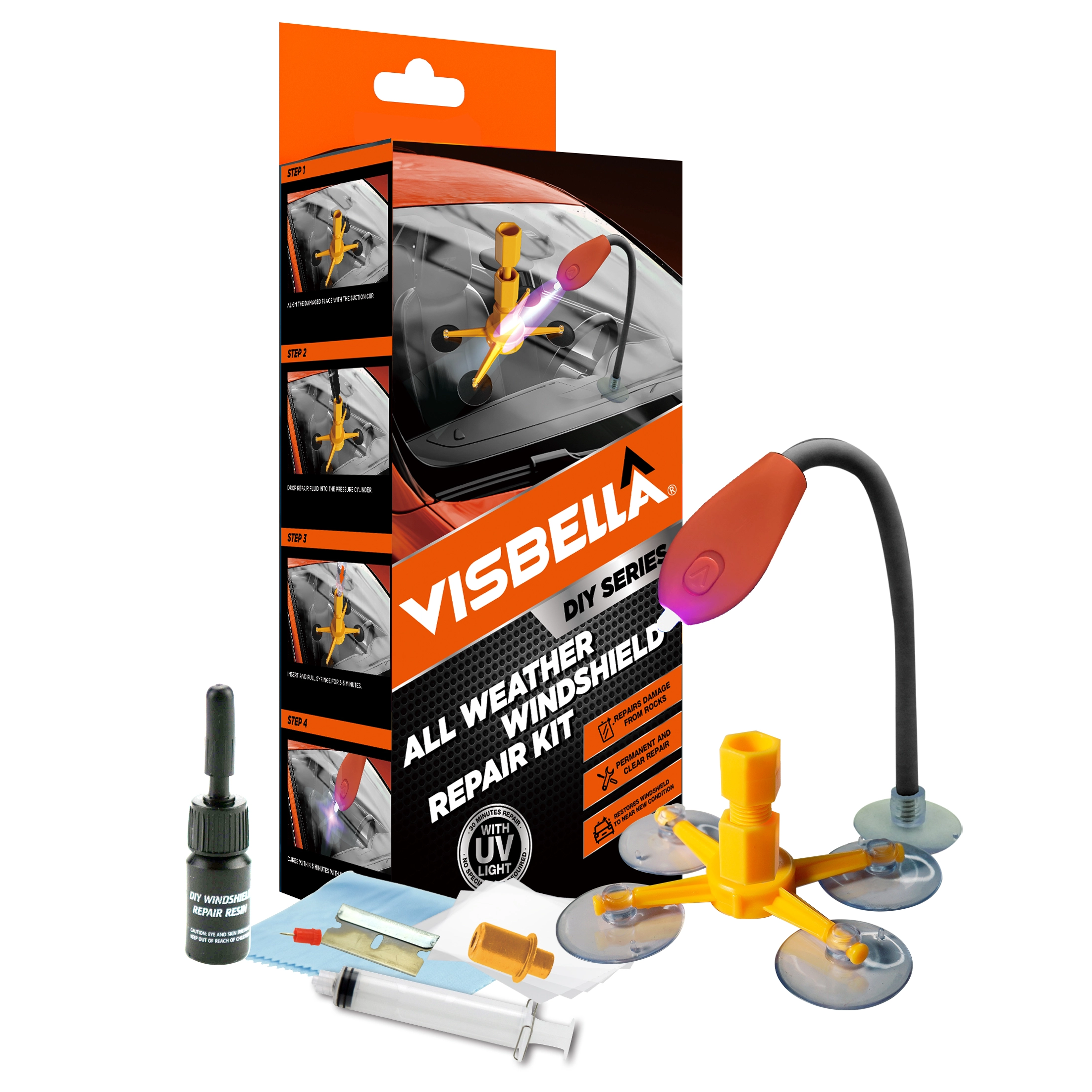 Visbella® Windshield repair kit is very handy to help you to repair the broken windshield in just 30 minutes. This kit will minimize the appearance and stop the spread of chips and cracks in your windshield. It removes air from the break, fills it with durable resin and makes it even stronger than before. For best results, repairs should be made as soon as possible after the damage occurs and before the break is contaminated by dirt or water.