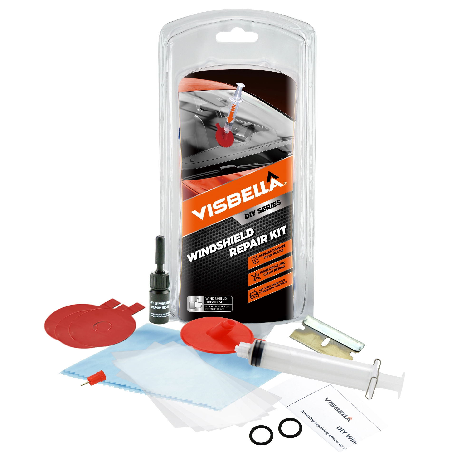 Visbella® Windshield repair kit is very handy to help you to repair the broken windshield in just 30 minutes. This kit will minimize the appearance and stop the spread of chips and cracks in your windshield. It removes air from the break, fills it with durable resin and makes it even stronger than before. For best results, repairs should be made as soon as possible after the damage occurs and before the break is contaminated by dirt or water.
