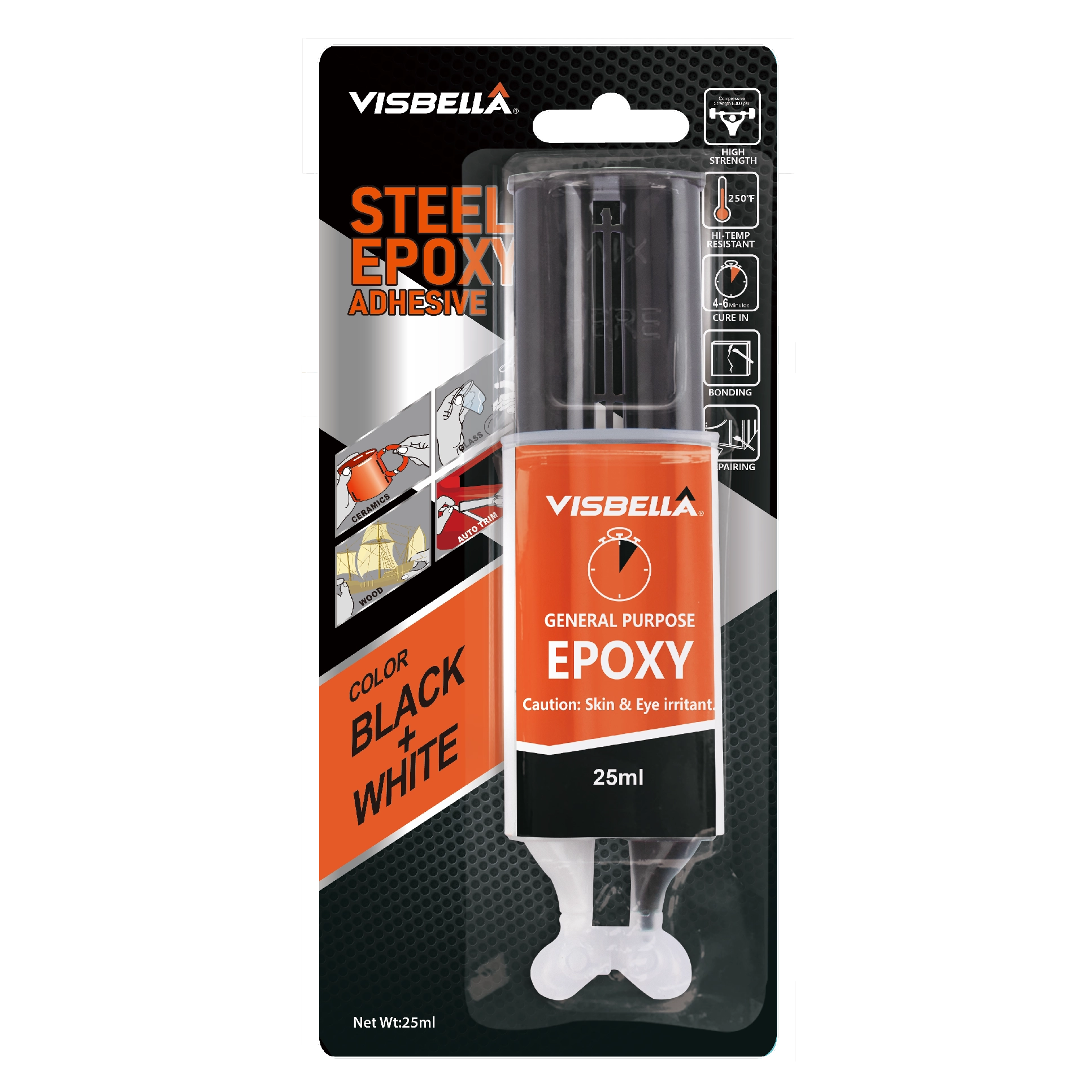 Visbella® Epoxy AB Glue is a kind of double component room temperature fast curing sealant. It is widely used in machinery and equipment, auto parts, sports equipment, metal-tools and accessories, rigid plastic or other emergency repairs. Fast bonding and packing, after curing has excellent bonding strength, acid and alkali resistance, moisture-proof and water proof, oil-proof and dust-proof good performance, high-heat and air-aging.