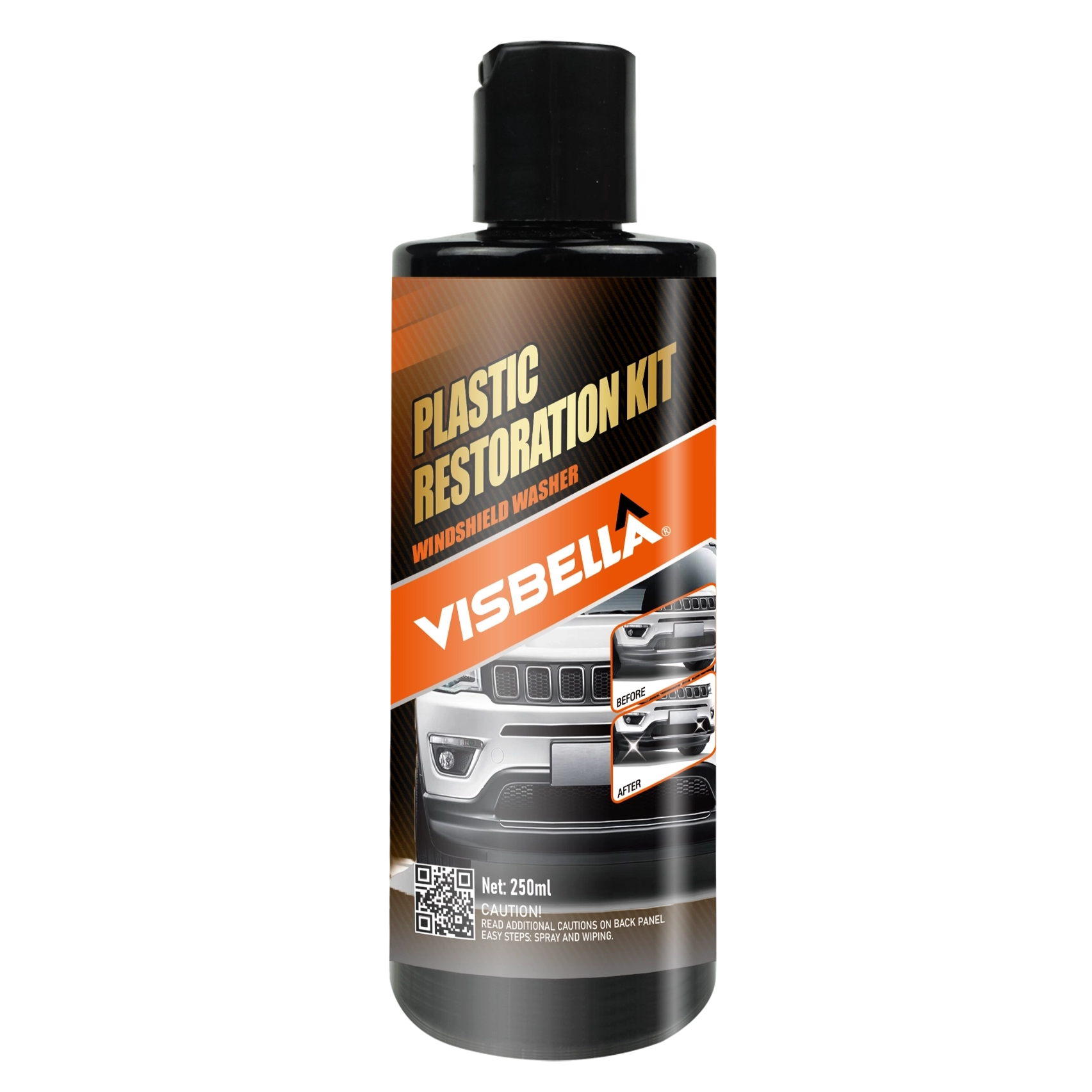 Visbella@ Plastic Restoration Kit is designed to renew and maintain trim and plastics like body cladding, window seals, molding, plastic wiper arms, door handles, tonneau covers and more. One easy applicationrestores the original appearance and shine to all colors of dull, faded trim. Long-lasting results will withstand weeks of car washes, rain storms, snow, and sun. lt also protects all plastic trim from fading caused by the sun's powerful uv rays. Our non-greasy formula dries almost instantly and will not streak when wet.