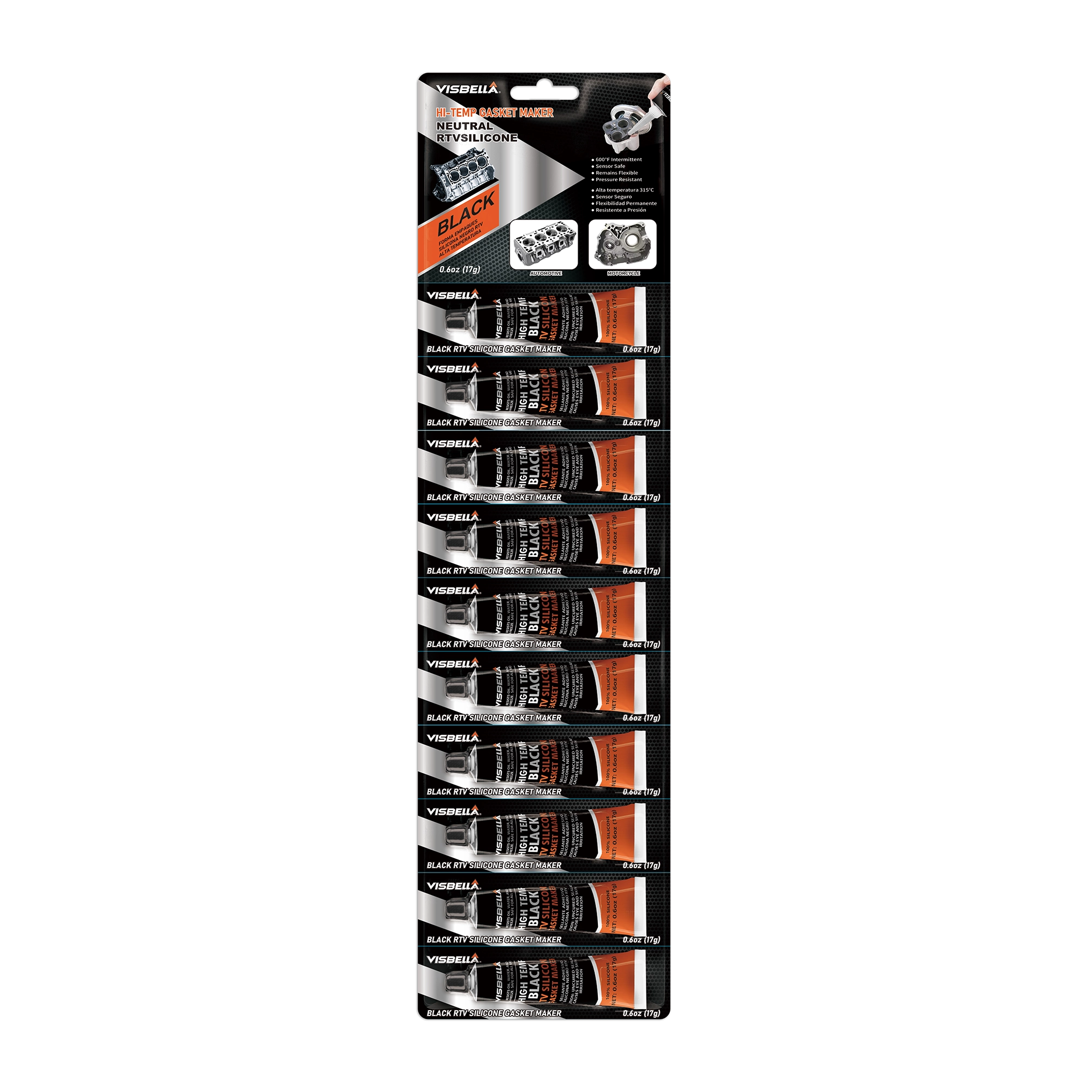 Visbella® RTV Silicone Gasket Maker is a premium neutral, non sag acetoxy curing paste engineered for high temperature sealing applications. This versatile automotive RTV silicone cures into a permanently flexible silicone rubber when exposed to atmospheric moisture at room temperature, offering exceptional resistance to weathering, moisture, vibration, and UV light.