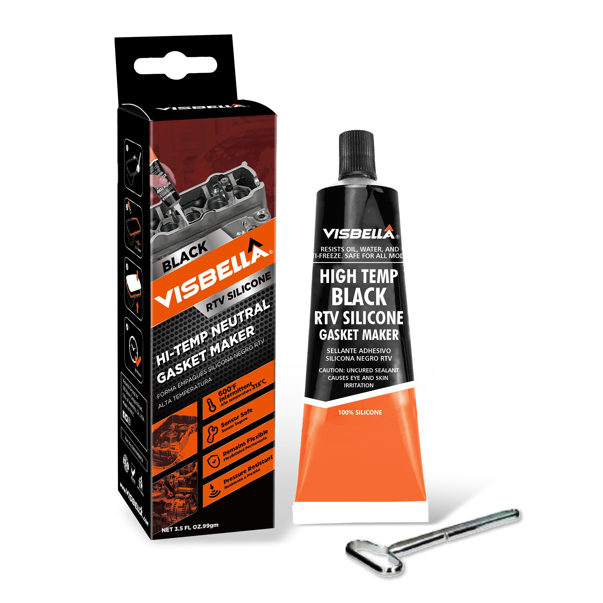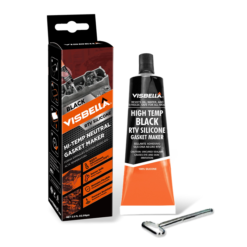 Visbella® High Temperature RTV Silicone gasket maker is designed for Automobile production of bonding and sealing. This product is a one component RTV Silicone sealant, curing completely without excitant odor release. Acid & Neutral solidified into elastic tubber strip.The product is heat stabilized, and it is permanently flexible and stable at temperatures from -54°C to 343°C. It is also highly resistant to oil, transmission fluid, and antifreeze.