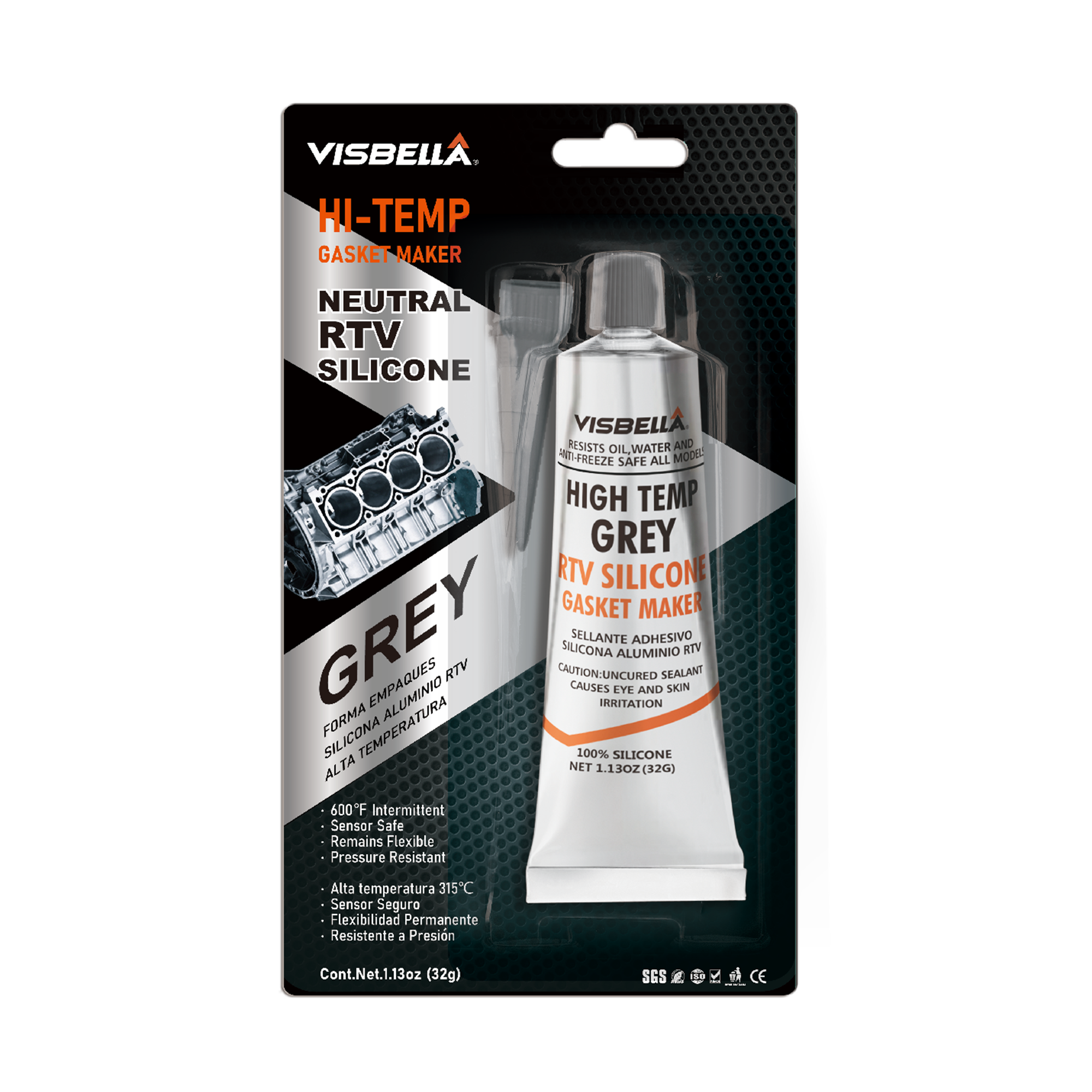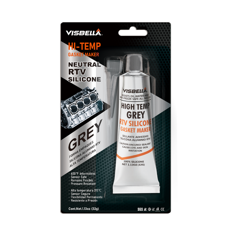 Visbella® RTV Silicone GREY 32G is a premium high temperature RTV silicone gasket maker engineered to deliver exceptional sealing performance for a wide range of industrial, automotive, and DIY applications. Crafted with 100% silicone, this neutral acetoxy curing paste cures to a permanently flexible silicone rubber when exposed to atmospheric moisture at room temperature—no special tools or heat required. It stands out for its impressive high temperature resistance (up to 315°C / 600°F intermittent), sensor safe design, and superior adhesion to diverse materials.
