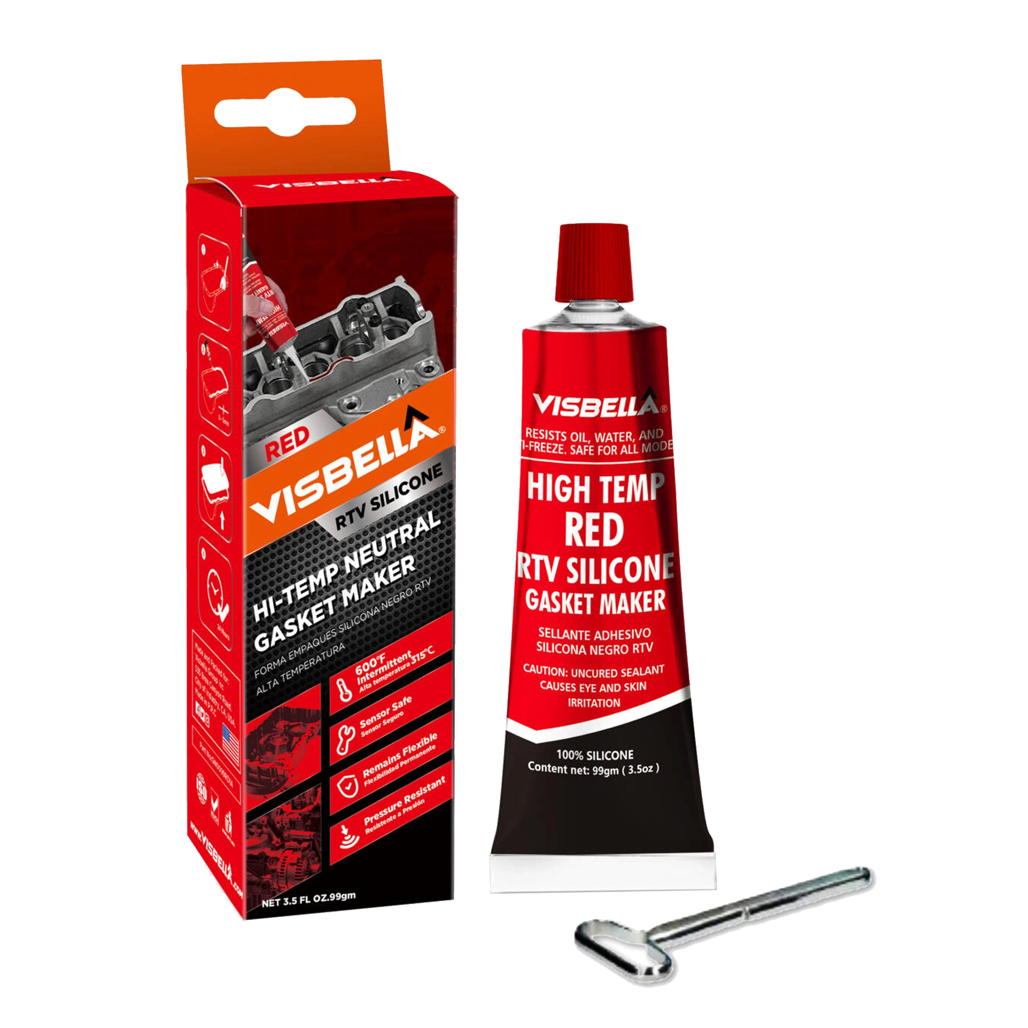 Visbella® High Temperature RTV Silicone is designed for automobile production of bonding and sealing. It is a one component RTV silicone sealant, forms to any size or shape gasket. It is resistant to both temperature and migration caused by thermal cycling. Can withstand temperature from -80°F up to 600°F(315°C). Ideal fro timing covers, intake manifolds, exhaust manifolds, cylinder heads, carburetors and more. It cures completely without excitant odor release. Acid&Neutral solidified into elastic rubber strip. Dries securely as a gasket.