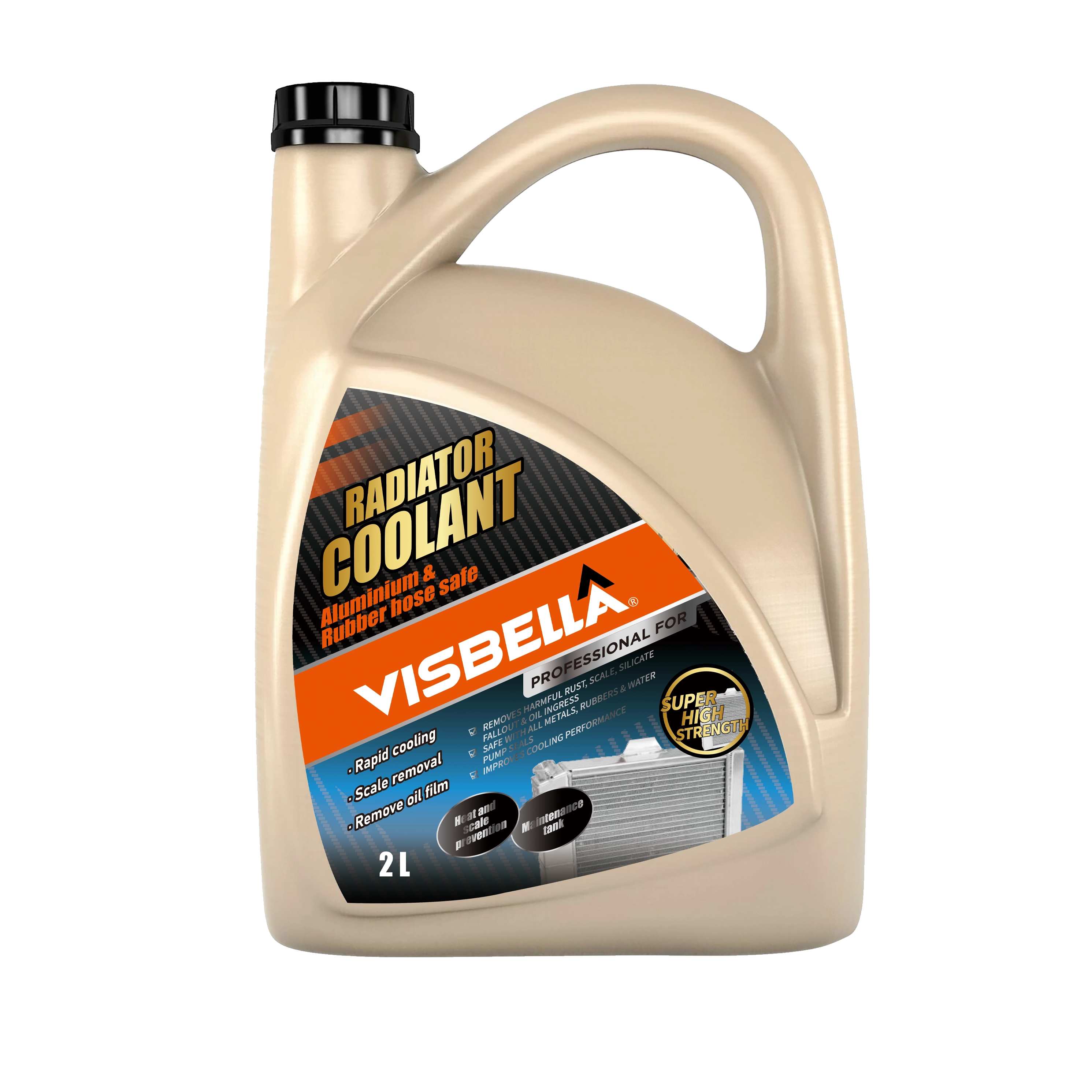 Visbella® Radiator Coolant is specially formulated to replenish and condition old Anti - freeze. It can work effectively all year round as an anti-overheating element. It's fortified inhibitors protect the co ling system against rust and scale, promoting an effective transfer of heat from engine to radiator. Extends the life - span of the radiator, engine parts and protects the cooling system.