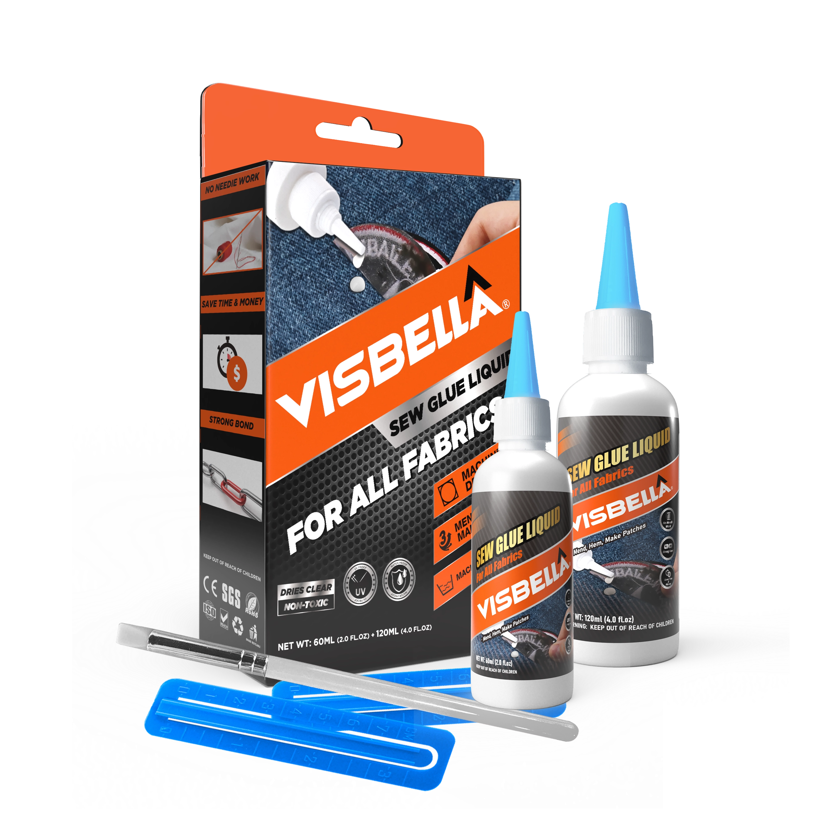 Visbella Bond Sew Liquid :No needle? No thread? No problem! Use our amazing New Liquid Sew to repair tears, mend rips and create beautiful clothing, crafts and home decoration projects! Washable, flexible, quick drying and colorless! It lets you successfully mend, alter, hem or patch all types of fabrics, then clean up stray fibers for a neat, professional look. Whether you accessorize a hat, snazzy up a vest or revamp a lampshade, you'll love the convenience and ease of Liquid Sew. Great for mends and tears of all types, makes great press on patches.