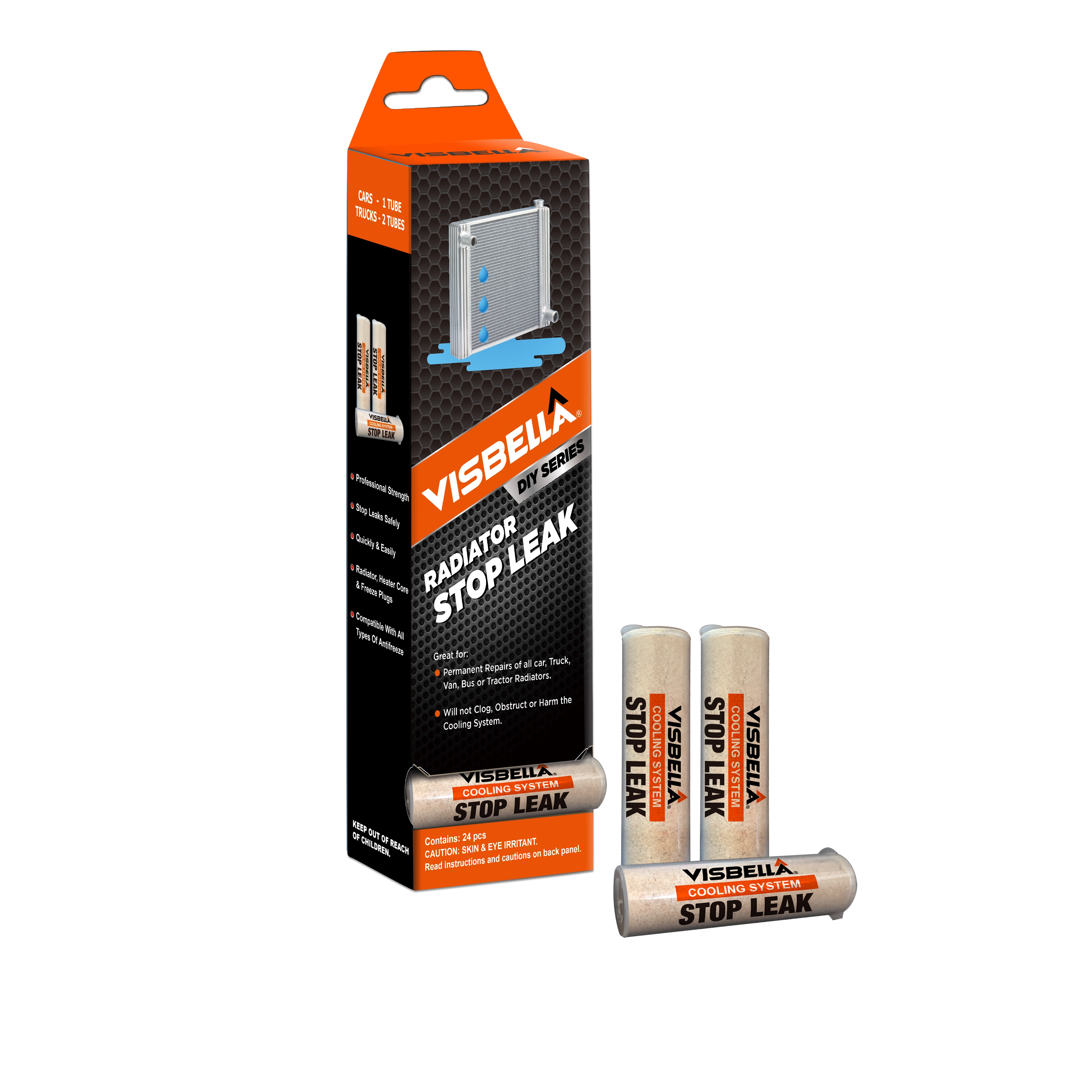 Visbella® Stop Leak is a non-toxic compound for stopping radiator and cooling system leaks. It can quickly mix and flow into all areas of the cooling system to fix and seal leaks and permanent repairs for all Car, Truck, Van, Bus and Tractor Radiators.Powder is safe with all types of antifreeze and will not clog or harm your cooling system, but act as a rust inhibitor and lubricant to internal cooling system parts.
